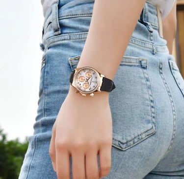 This women’s luxury watch features a sleek and sophisticated dial, paired with a genuine leather strap that offers comfortable and durability. The minimalist yet stylish design makes it suitable for business wear, casual outfits, and formal events.