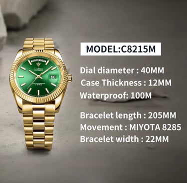 The CADISEN DD40 men’s luxury automatic watch features a reliable MIYOTA 8285 mechanical movement, durable AR sapphire glass, and a refined design built for everyday elegance. With 10Bar water resistance and a classic wristwatch profile, this timepiece combines precision, strength, and timeless style, perfect for modern men who value performance and sophistication.